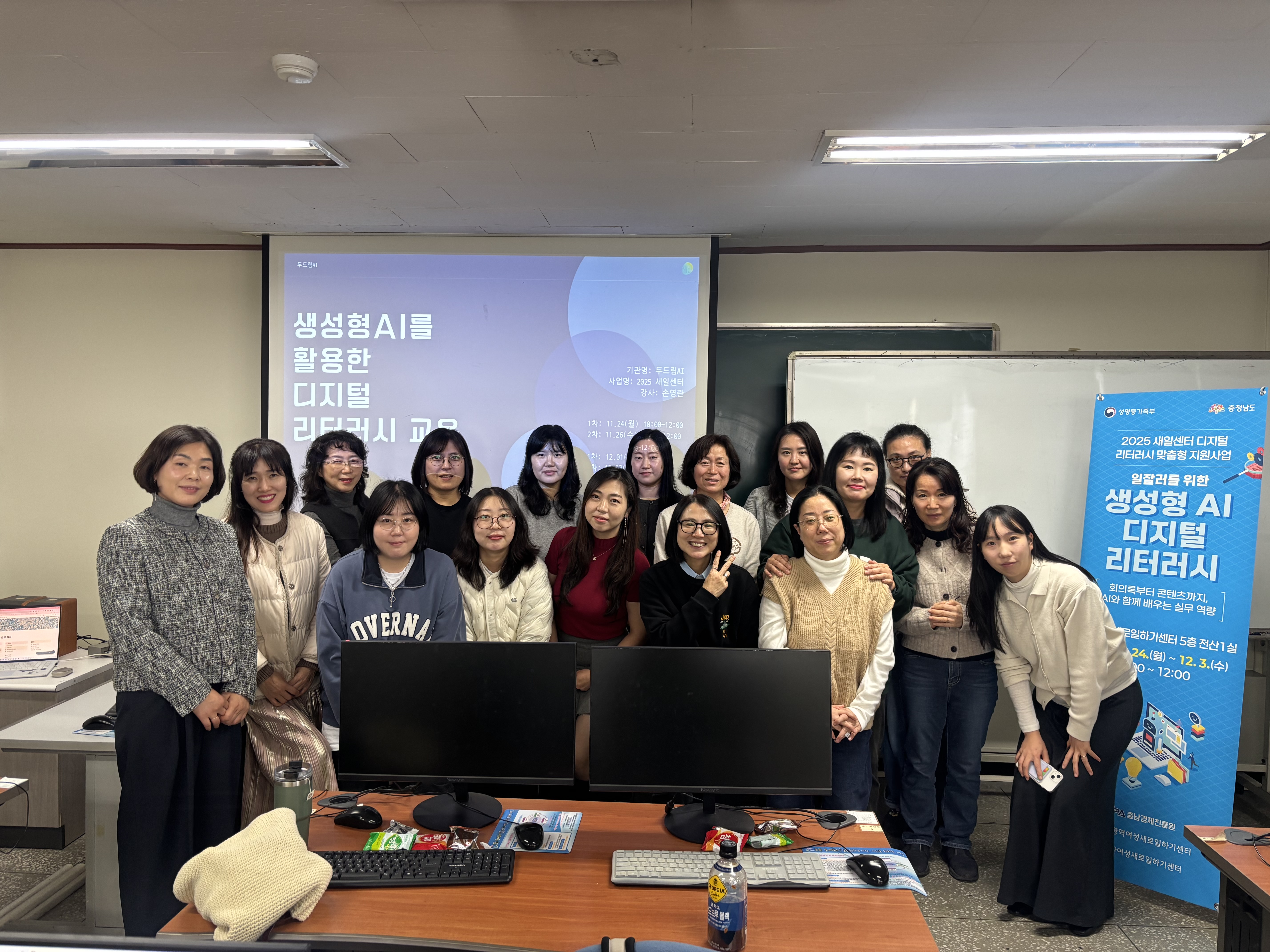 충남경제진흥원(원장 한권희) 내 충남광역여성새로일하기센터(이하 충남광역새일센터)는 천안새일센터와 함께 「2025 새일센터 디지털 리터러시 맞춤형 지원사업」의 마지막 교육을 11월 24일, 26일과 12월 1일, 3일 총 4회차 일정으로 성황리에 마무리했다. 이번 교육은 여성의 AI 실무 활용 능력 강화와 직무 생산성 향상, 취·창업 경쟁력 제고를 목표로 진행됐으며, 천안 지역 구직자 및 재직 여성 등 총 60명이 참여했다. 교육 과정은 이번 과정은 디지털 리터러시 전문강사 손영란 강사가 진행했으며, AI 기초부터 실무 응용까지 단계적으로 구성해 참여자들이 현장에서 바로 활용 가능한 디지털 실무 역량을 갖출 수 있도록 지원했다. 참여자들은 손영란 강사는 “AI는 이미 모든 업무에서 필수 도구가 되고 있다”며 “이번 교육이 여성들이 기술 변화에 능동적으로 대응하고 새로운 기회를 만들어가는 출발점이 되길 바란다”고 말했다. 이번 단계별 교육 운영을 통해 지역 수요 기반 AI 실무 교육 모델을 정착했으며, 이를 바탕으로 충남형 여성 디지털 역량 강화 정책 모델을 고도화해 더 많은 여성들이 디지털 전환 시대에 안정적으로 일할 수 있는 환경을 마련할 계획이다. |