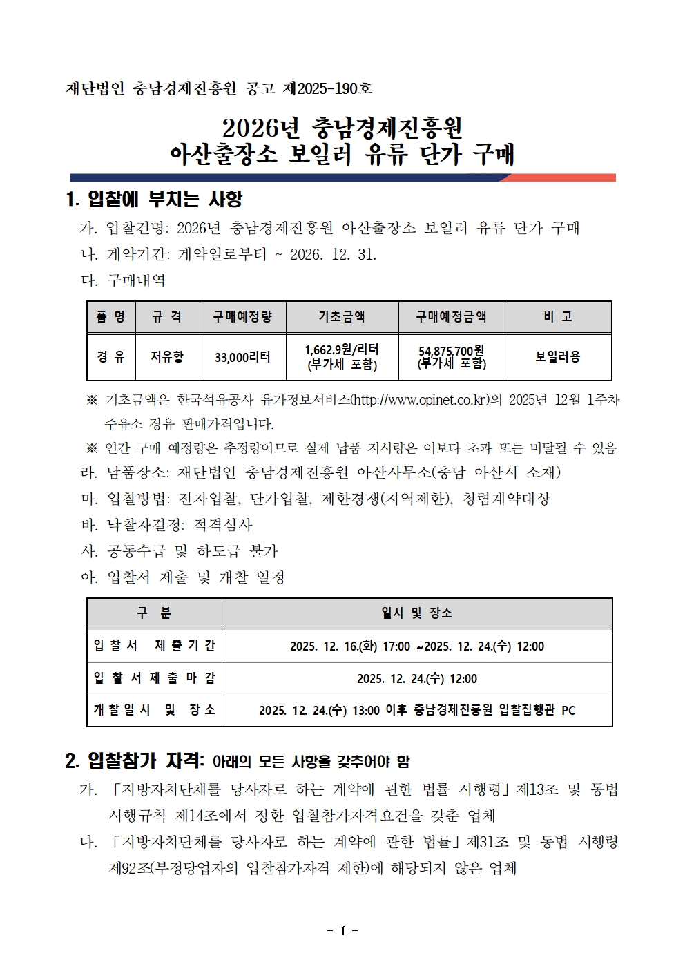 2026년 충남경제진흥원 아산출장소 보일러 유류 단가 구매 입찰 공고