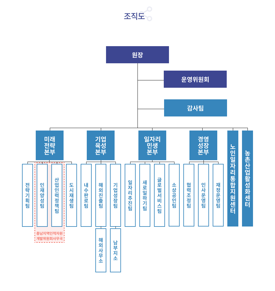| 미래전략본부 | 경제위기대응, 경제교육, 농촌융복합산업 지원, 농촌 마을만들기 지원, 도시재생 활성화 지원, 온라인 플랫폼 관련 사업 총괄 |