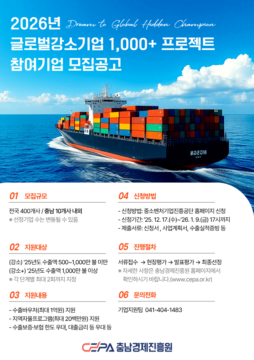 | 2026년 충남 글로벌 강소기업 1,000+ 프로젝트 참여기업 모집 | |||