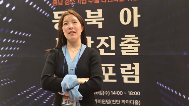 김한들(25) 대표가 지난달 천안 라마다 앙코르 호텔에서 열린 충남경제진흥원·동북아학회 공동 주최 '동북아시장진출전략 포럼'에 참석해 수출 시장 개척 방안에 대해 설명하고 있다. 천안=윤형권 기자