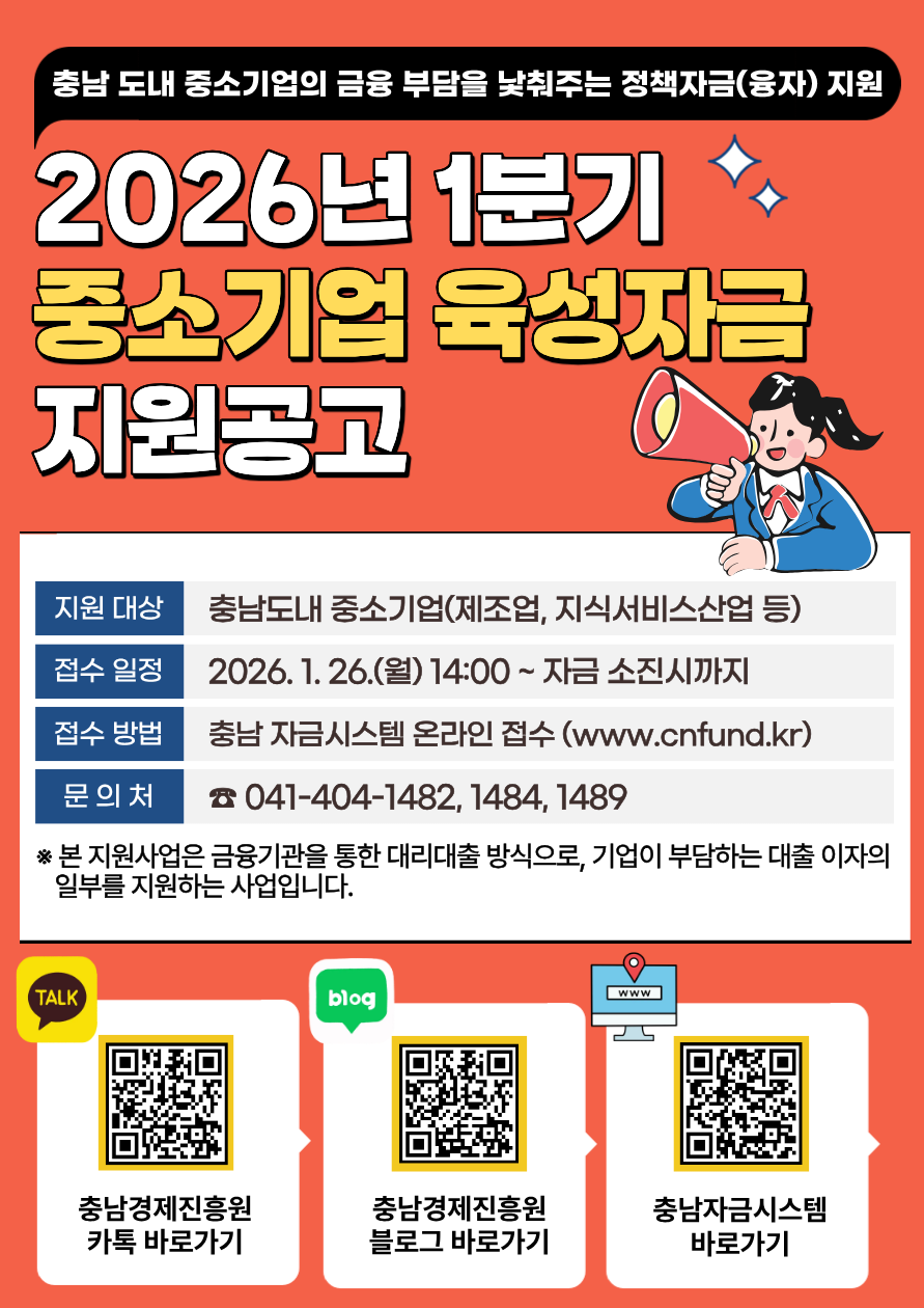 | 충남경제진흥원, 2026년 1분기 충남 중소기업육성자금 융자 접수 시작...1월 26일부터 신청 접수 | |||