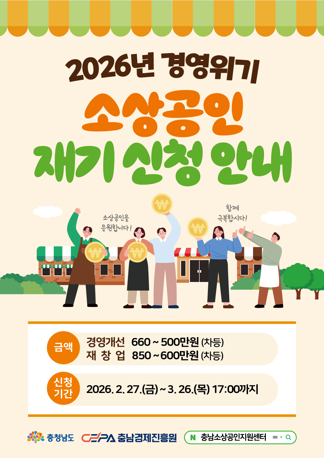 충청남도와 충남경제진흥원(원장 한권희, 이하 진흥원)은 도내 소상공인의 경영 위기 극복과 안정적인 재기 지원을 위해 ‘2026년 경영위기 소상공인 재기 지원사업’ 참여 업체를 모집중에 있다고 12일 밝혔다. 이번 사업은 매출 감소로 어려움을 겪는 소상공인에게 현장 멘토링과 자금을 지원하여 경영 정상화를 돕고, 폐업 후 재도전을 꿈꾸는 이들에게 성공적인 재창업의 발판을 마련해주기 위해 기획되었다. 지원 규모는 총 420개 업체 내외로, 경영 위기 극복을 위한 경영개선 분야 370업체와 새로운 시작을 돕는 재창업 분야 50업체를 선정한다. 선정평가 결과에 따라 사업화 자금을 차등 지급하며, 경영개선 분야는 최대 660만원, 재창업 분야는 최대 850만원까지 전액 보조(부가세 본인 부담)로 지원받을 수 있다. 지원 항목은 매장 모델링(인테리어 등), 브랜드 개발, 마케팅 홍보, 온라인 판로 확대, 제품 개선 등으로 소상공인이 실질적인 경쟁력을 확보하는 데 필요한 항목들로 구성되었다. 지원 대상은 전년 대비 월평균 매출이 감소했거나 재창업을 희망하는 소상공인이다. 신청 기간은 2026년 3월 26일(목) 17시까지이며, 충남경제진흥원 통합지원시스템(www.cnsp.or.kr)을 통해 온라인으로 접수할 수 있다. 충남경제진흥원 충남소상공인지원센터장은 “고물가와 경기 침체로 많은 소상공인이 한계 상황에 직면해 있다”며, “이번 재기 지원사업이 도내 소상공인들이 다시 일어설 수 있는 실질적인 마중물이 되기를 기대한다”고 전했다. 사업에 관한 자세한 사항은 충남경제진흥원 및 충남소상공인지원센터 홈페이지 공고문을 확인하거나 보부상콜센터(041-424-4000)로 문의하면 된다. |